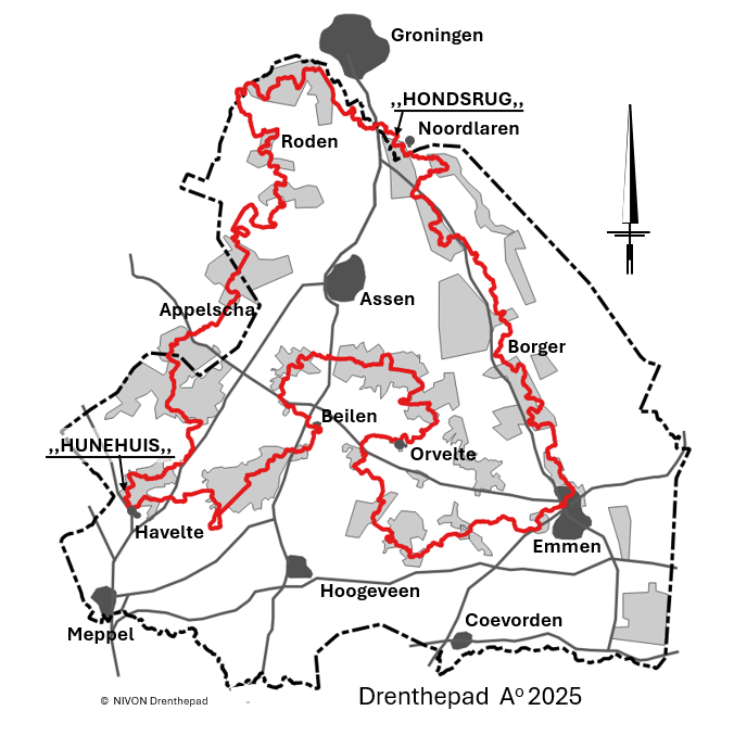 Een 32x32 poster van de routelijn van het Drenthepad de originele enige echte. Verkrijgbaar in drie edities, 1975, zoals afgedrukt in de eerste wandelgids, of de routelijn van 2009 en de routelijn van 2025.